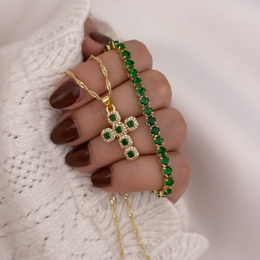 Cadena Singapur de Dama de 45cm + Cruz Verde Esmeralda + Pulsera Tennis Verde Esmeralda en Oro Laminado 18k con Garantia de por vida