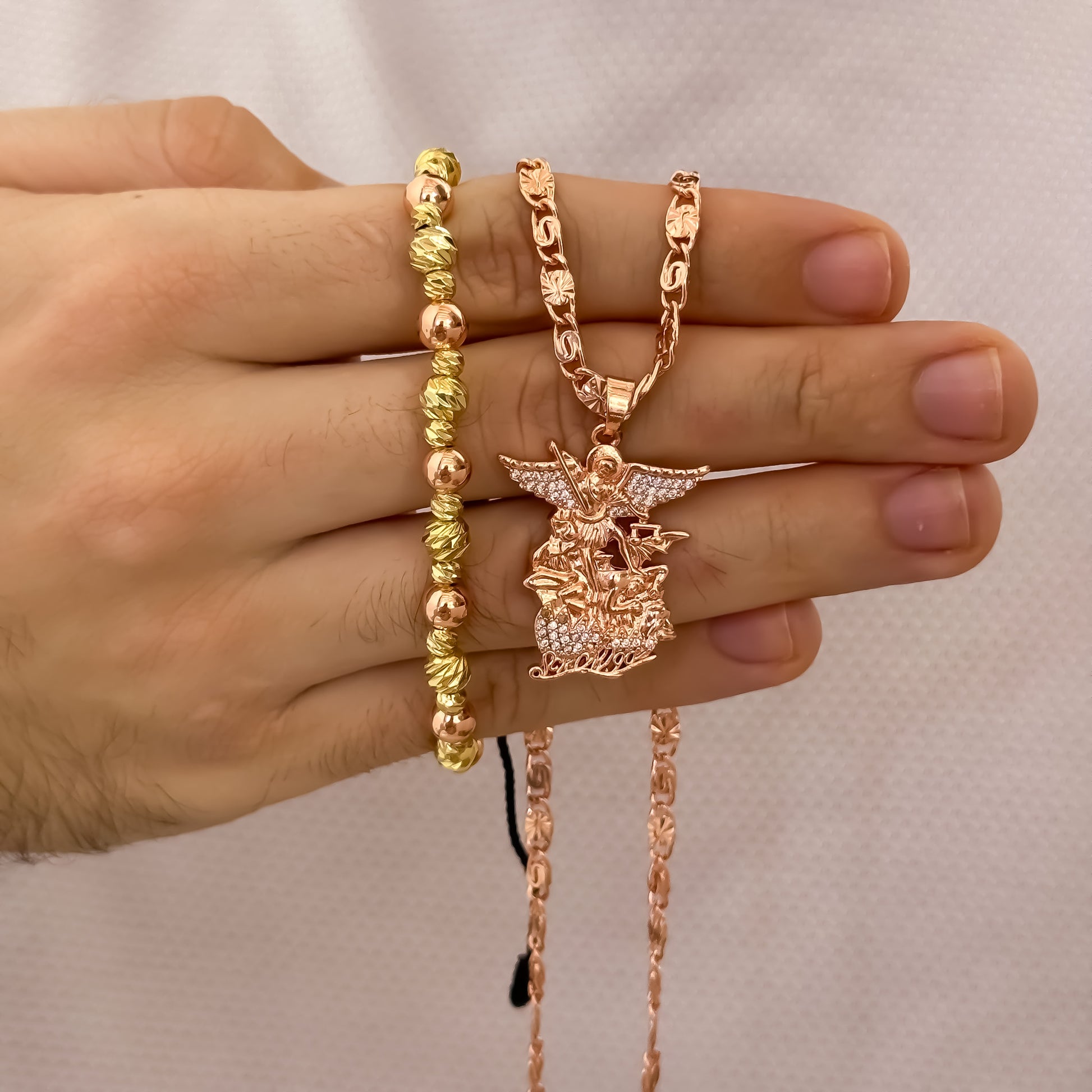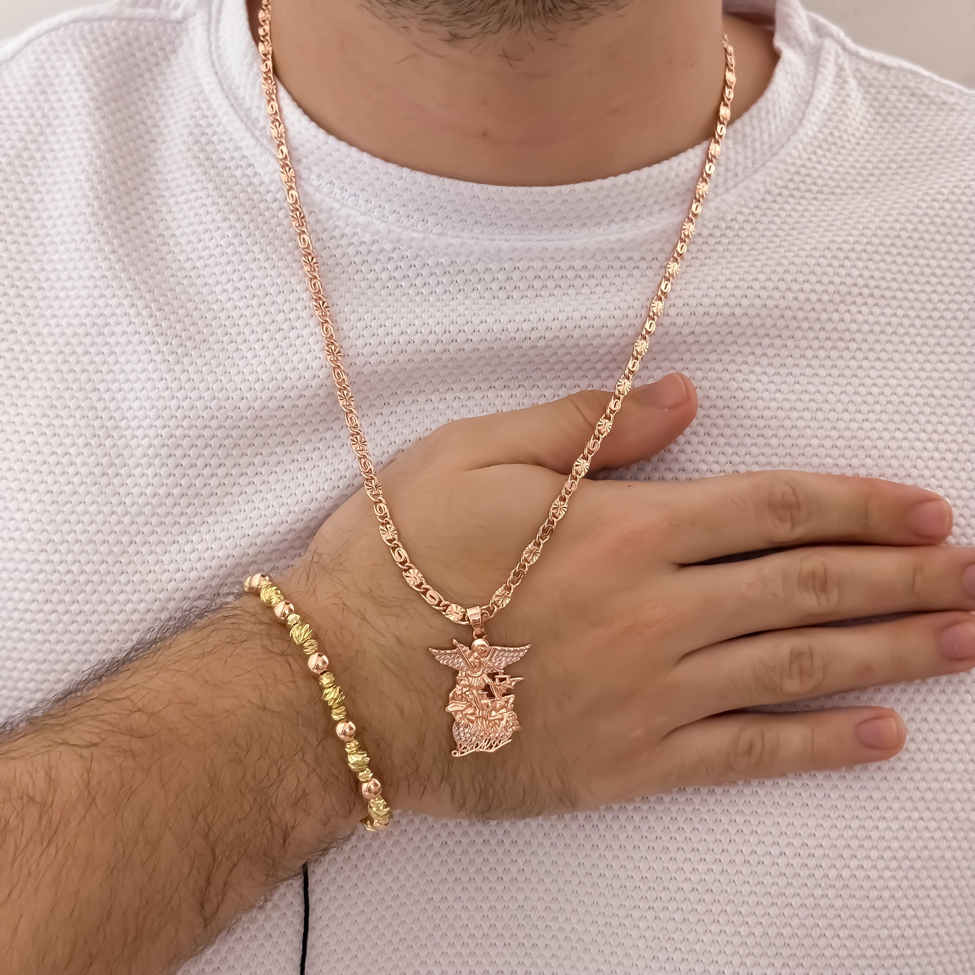 Cadena Tejido Caracol 60cm de 4mm + San Miguel Arcangel en Oro Rosa Laminado 18k + Pulsera Balin italiano de 5mm en Oro Ros con Garantia de por vida