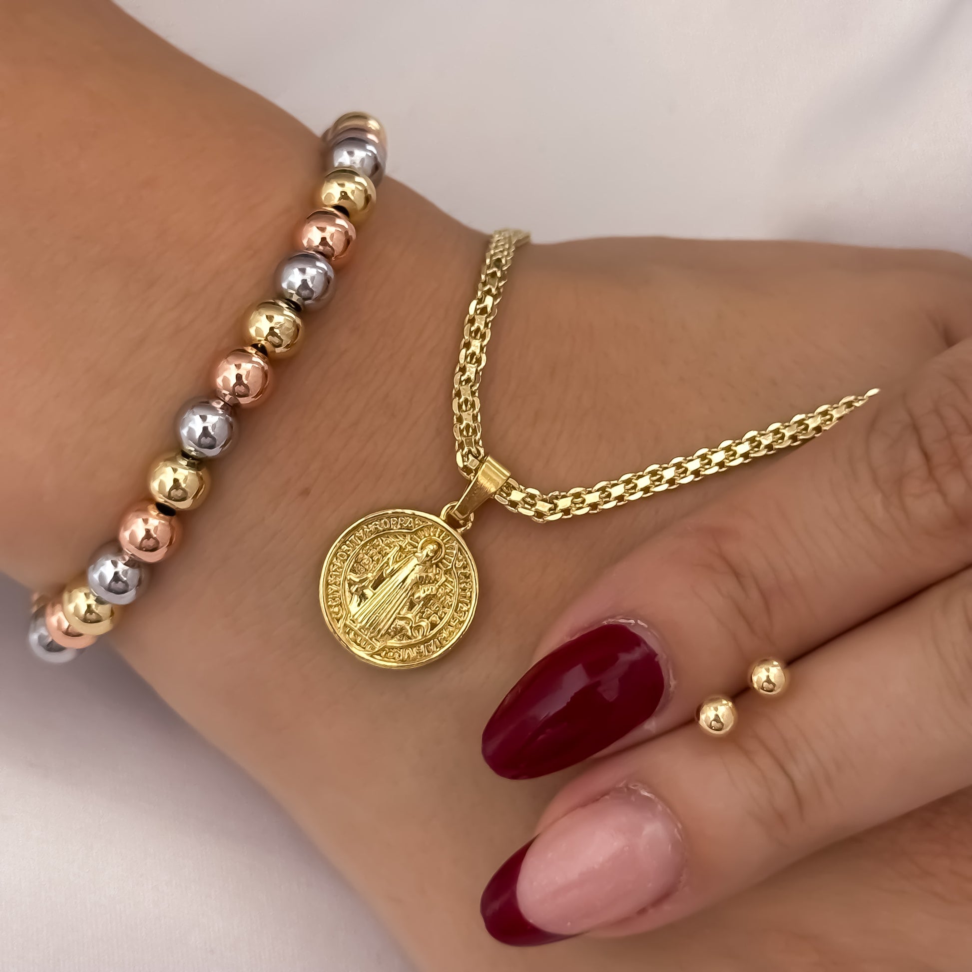 Cadena Tejido Chino de Dama de 45cm de 3mm + San Benito + Topo balin de 4mm + Pulsera de 3 Oros en Balin Liso de 6mm en Oro Laminado 18k con Garantia de por vida