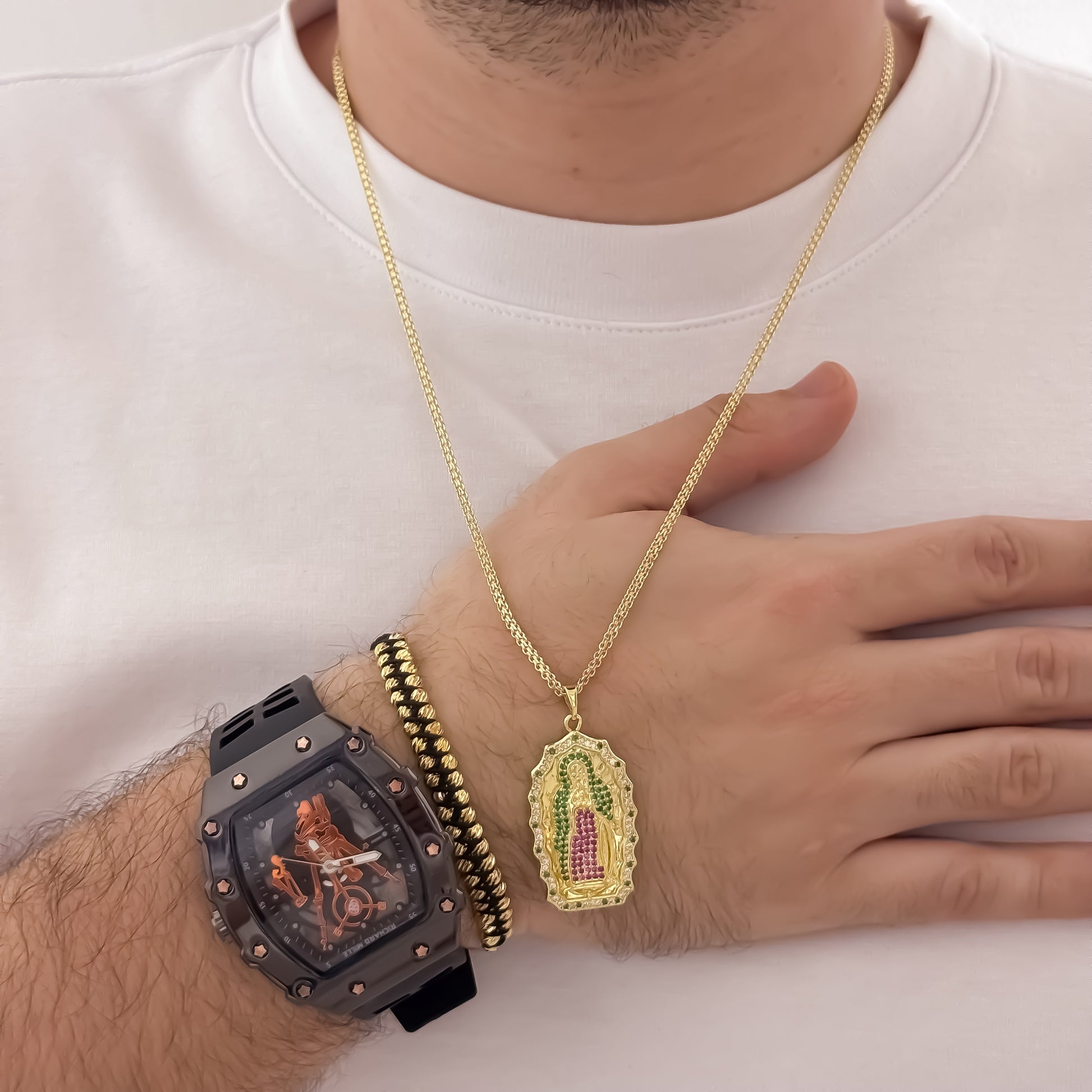 Cadena Tejido Chino de Hombre de 60cm de 3mm + Virgen de Guadalupe Tallada Circones Verde + Pulsera Doble Carril Balin Italiano de 4mm + Reloj Richard en Oro Laminado 18k con Garantia de por vida
