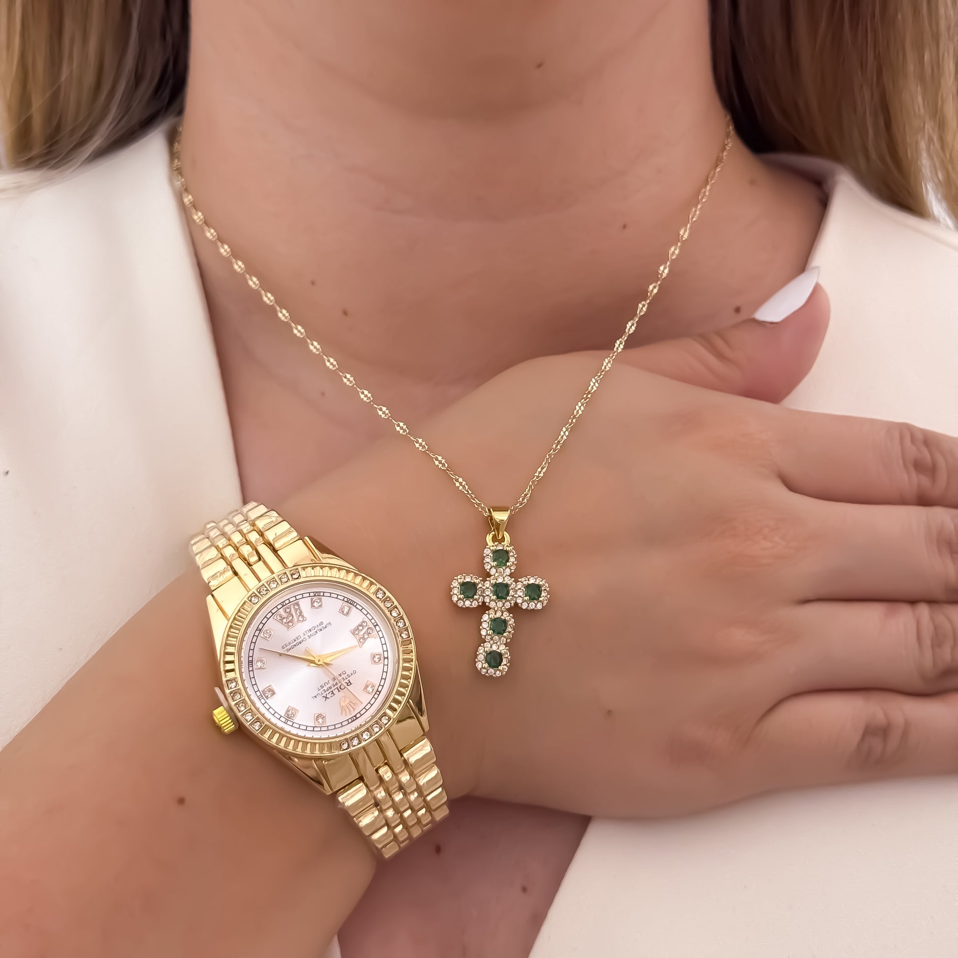Conjunto de Lujo Oro Laminado 18K – Cruz Verde Esmeralda & RELOJ ROLEX DAMA