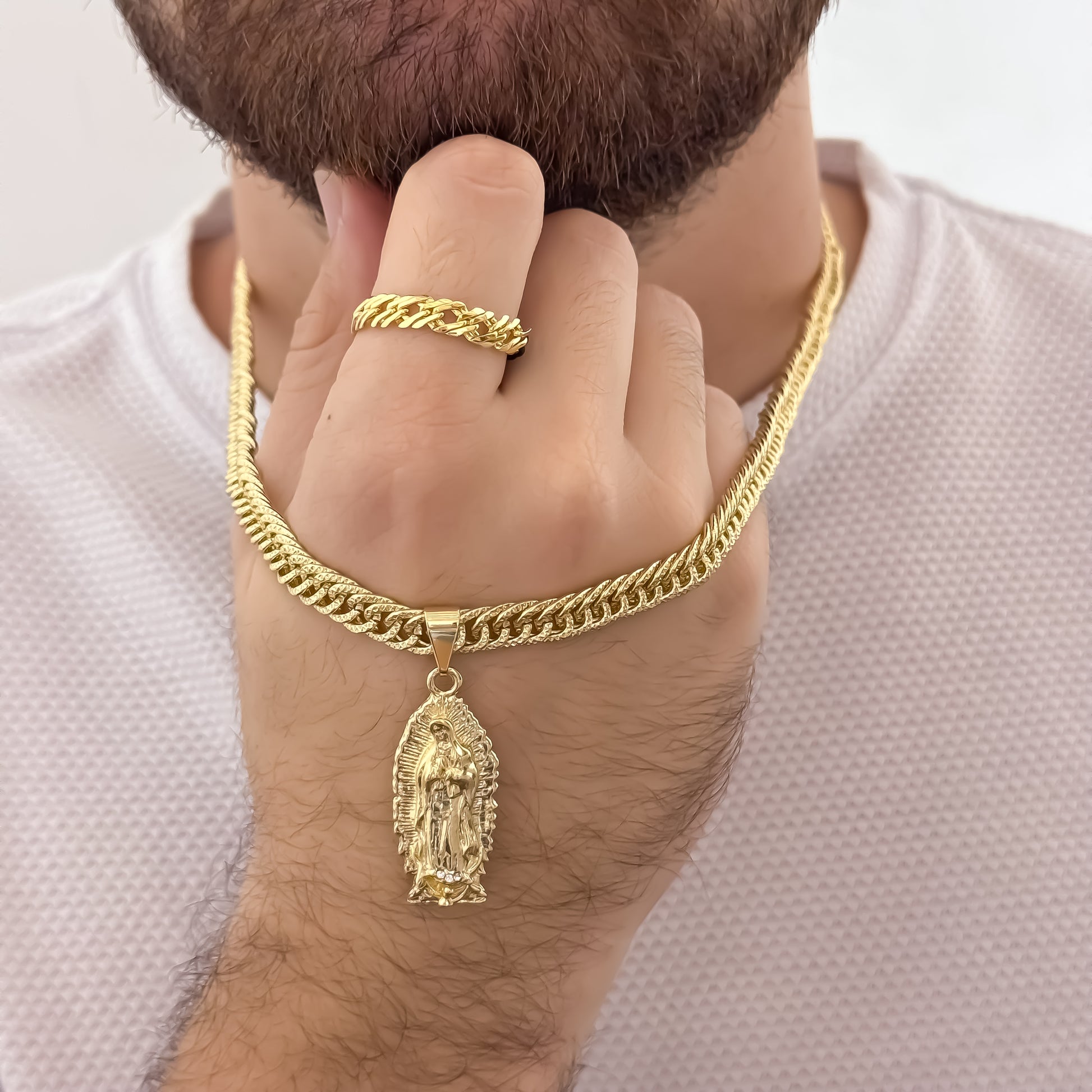 Cadena Tejido Cubana Continuar de 60cm de 5mm + Virgen de Guadalupe Tallada + Anillo Tejido Cubana Continua en Oro Laminado 18k con Garantia de por vida