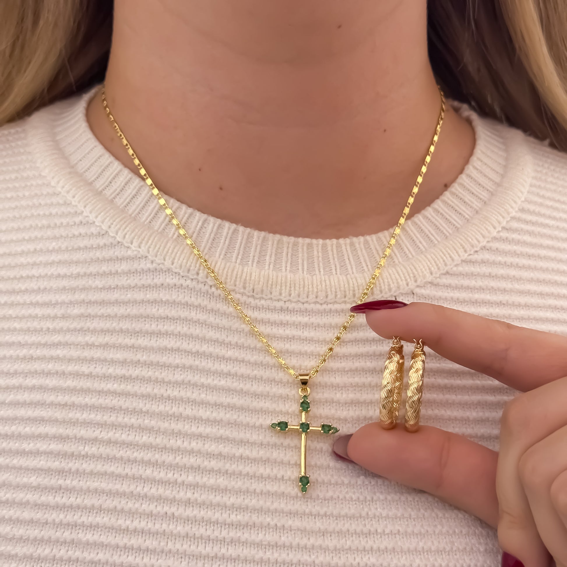 Cadena Tejido Escalera Plana de 45cm de 2mm + Cruz Verde Esmeralda + Candongas Tallada en Oro Laminado 18k con Garantia de por vida