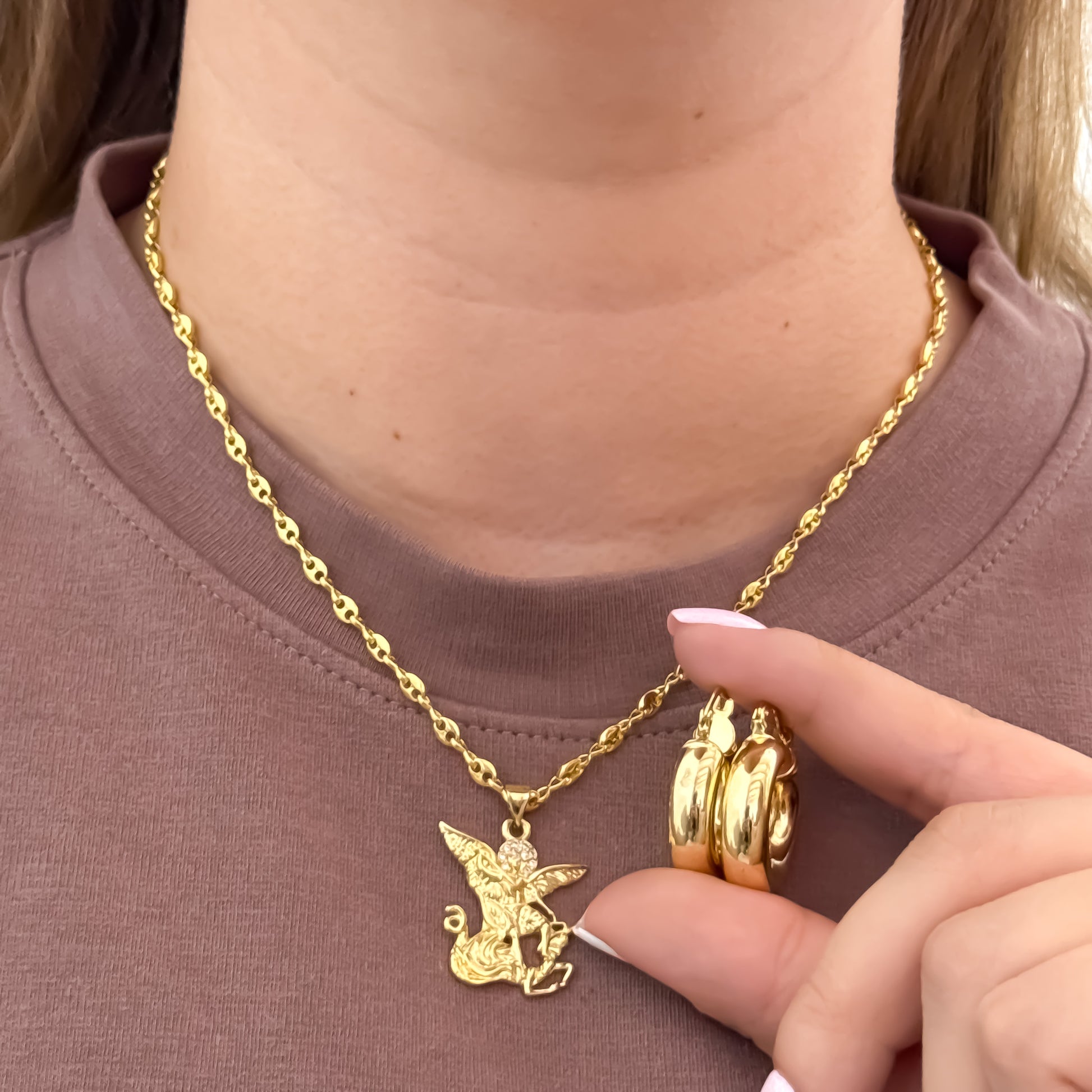 Cadena Tejido Gucci de Dama de 45cm de 3mm + San Miguel Arcangel + Candonga Tubular en Oro laminado 18k con Garantia de por vida