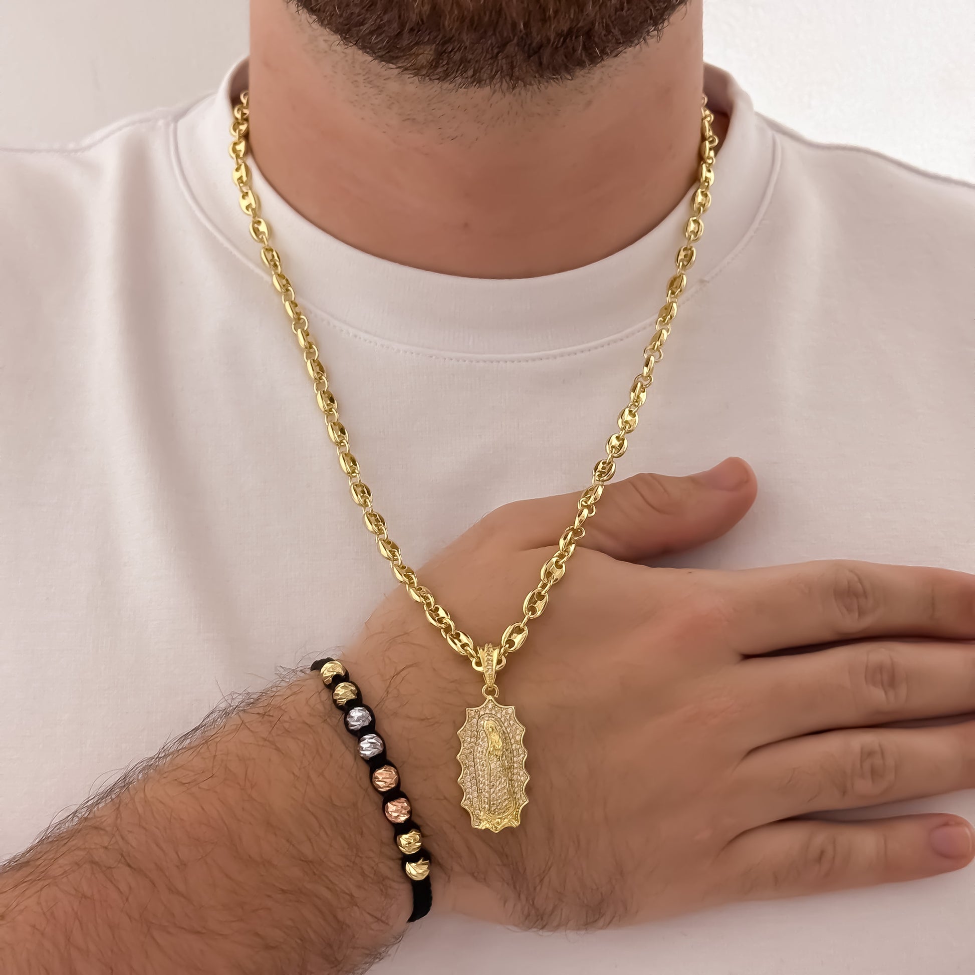 Cadena Tejido Gucci de Hombre de 60cm de 5mm + Virgen de Guadalupe Micro Circones Cristales + Pulseras de 3 OROS Balin Italiano en Oro Laminado 18k con Garantía de por vida