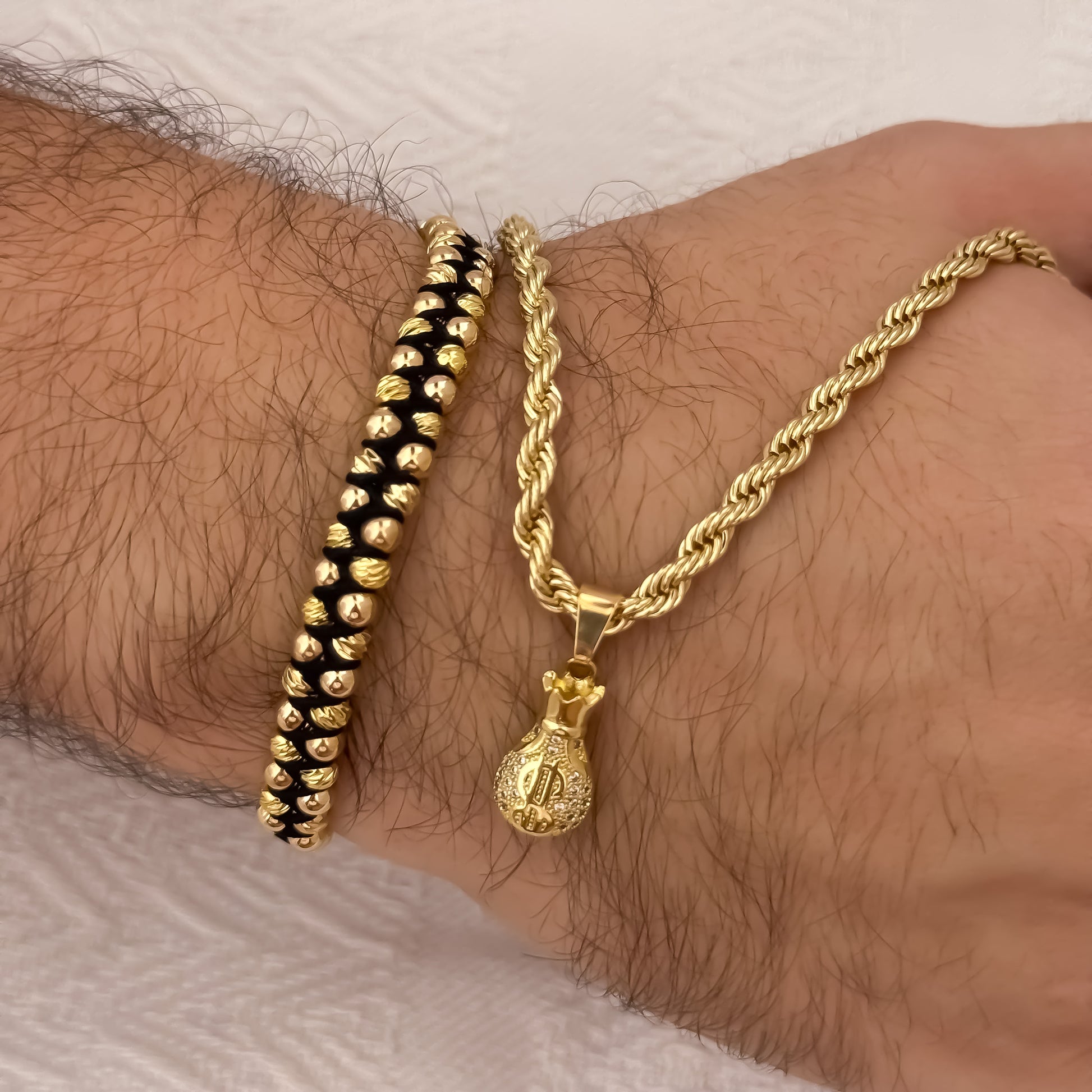Cadena Tejido Lazo Siciliano de 60cm de 5mm + Dije de Bolsa de Dinero con Micro Circones + Pulsera Doble Carril Italiano de 5mm en Oro laminado 18k con Garantía de por vida
