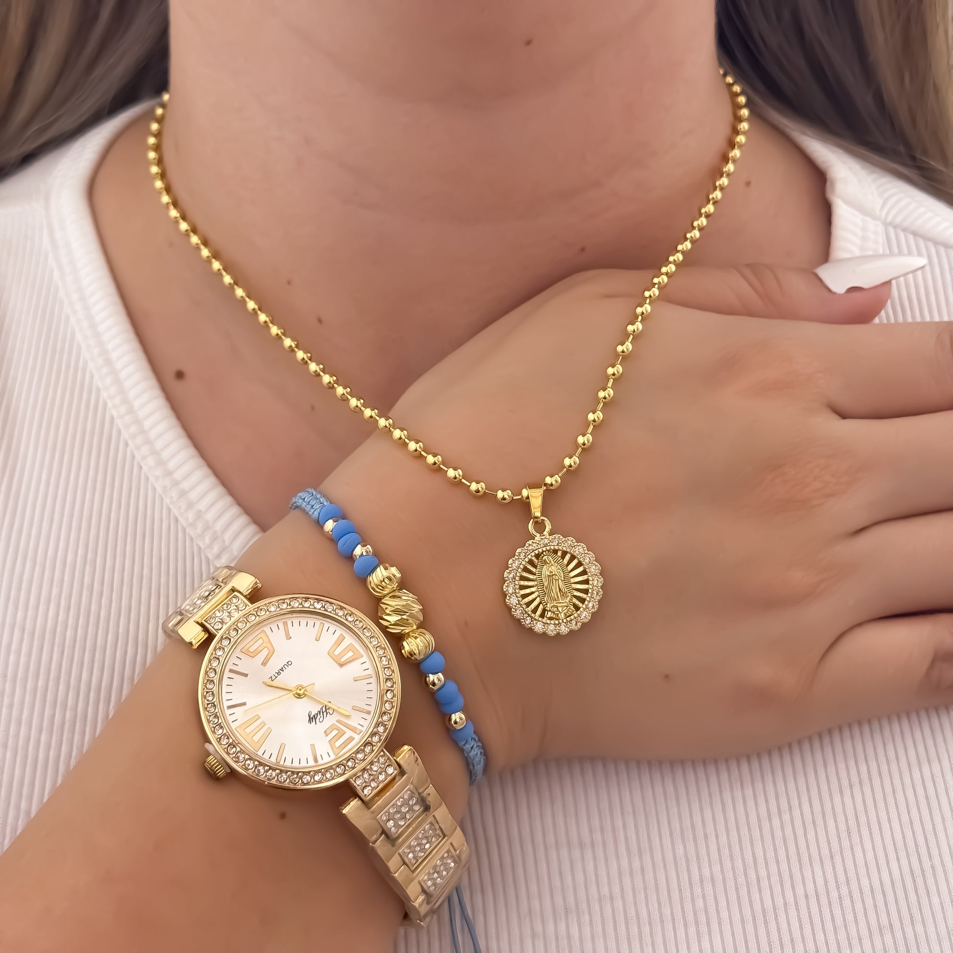 Cadena de tejido militar 45 cm en oro laminado 18K. Dije circular tallado de la Virgen de Guadalupe con borde diamantado. Pulsera ajustable en hilo azul con balines dorados diamantados. Reloj circular dorado con incrustaciones brillantes.