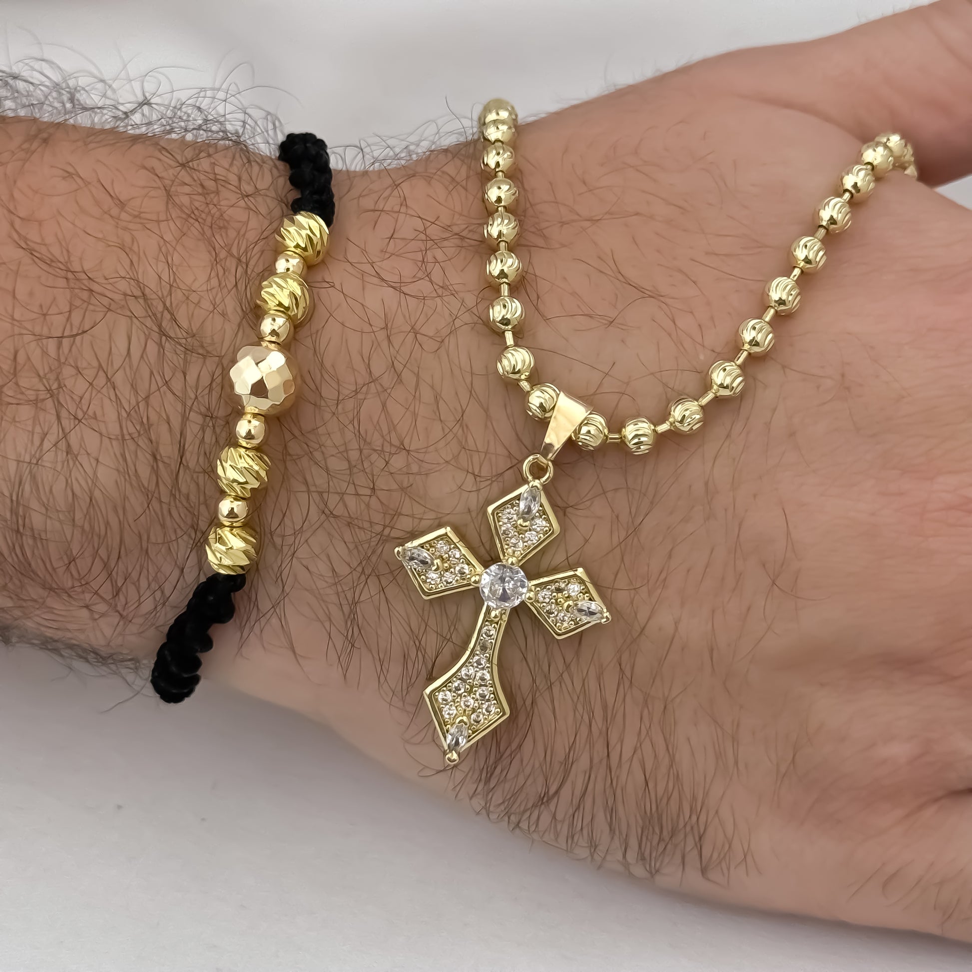 🔥 Conjunto Exclusivo para Hombres en Oro Laminado 18K Cadena Militar Diamantada de 60 cm (4 mm) + Dije Cruz Clavo con Micro Circones Negros + Pulseras Balín Italiano 3 Carriles de 4 mm