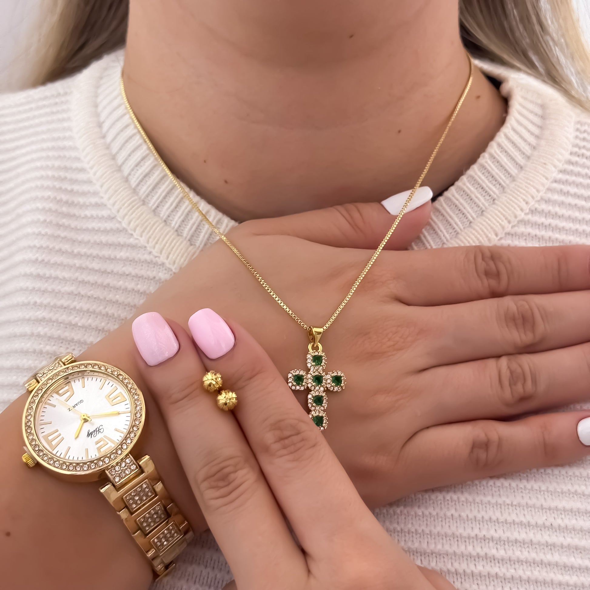 💚 CONJUNTO PARA DAMA — CRUZ VERDE ESMERALDA + RELOJ DAMA 💚