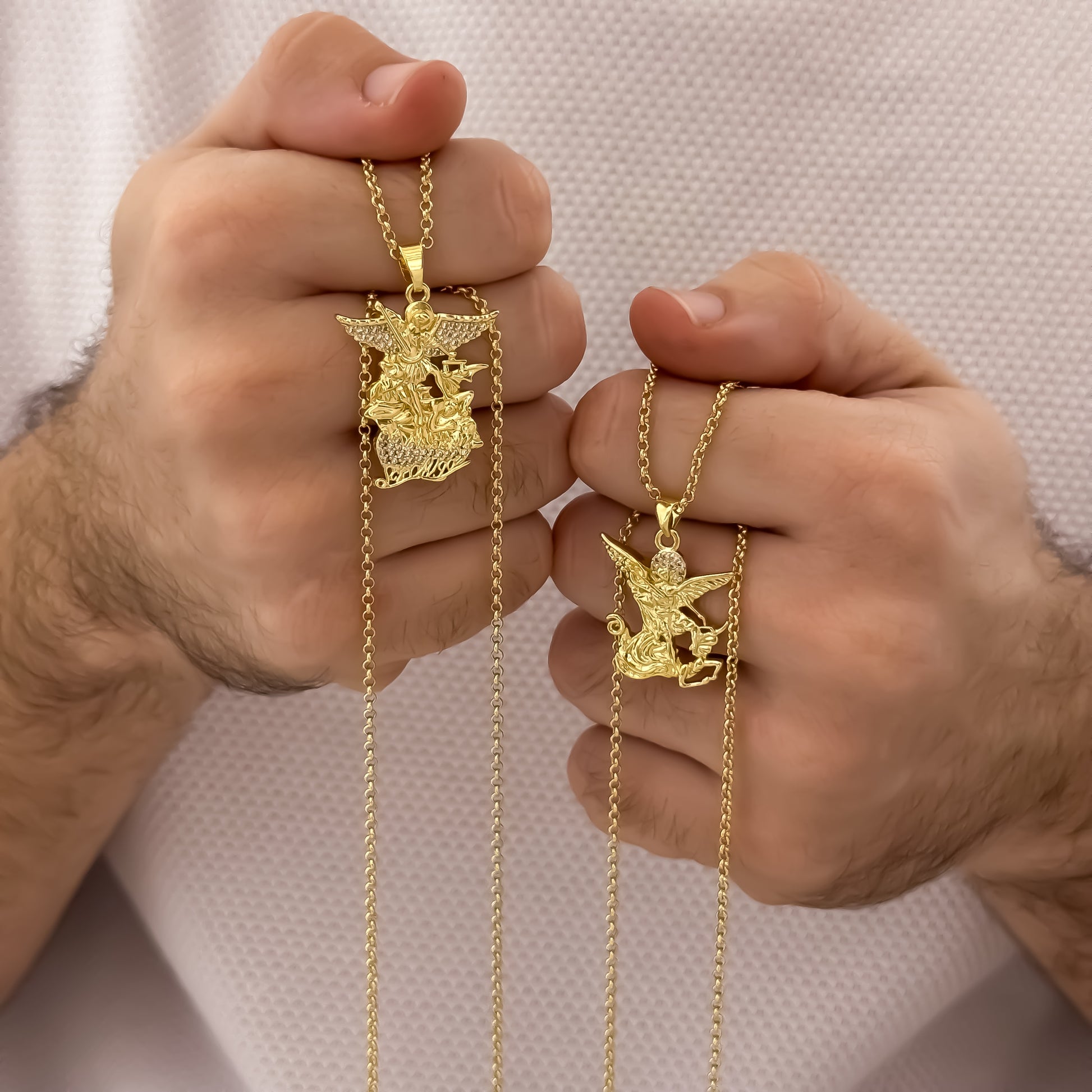 Incluye dos cadenas finamente trabajadas con dijes de la Dije de San Miguel Arcángel Protección decorados con micro circones verde esmeralda para un brillo elegante y significativo.