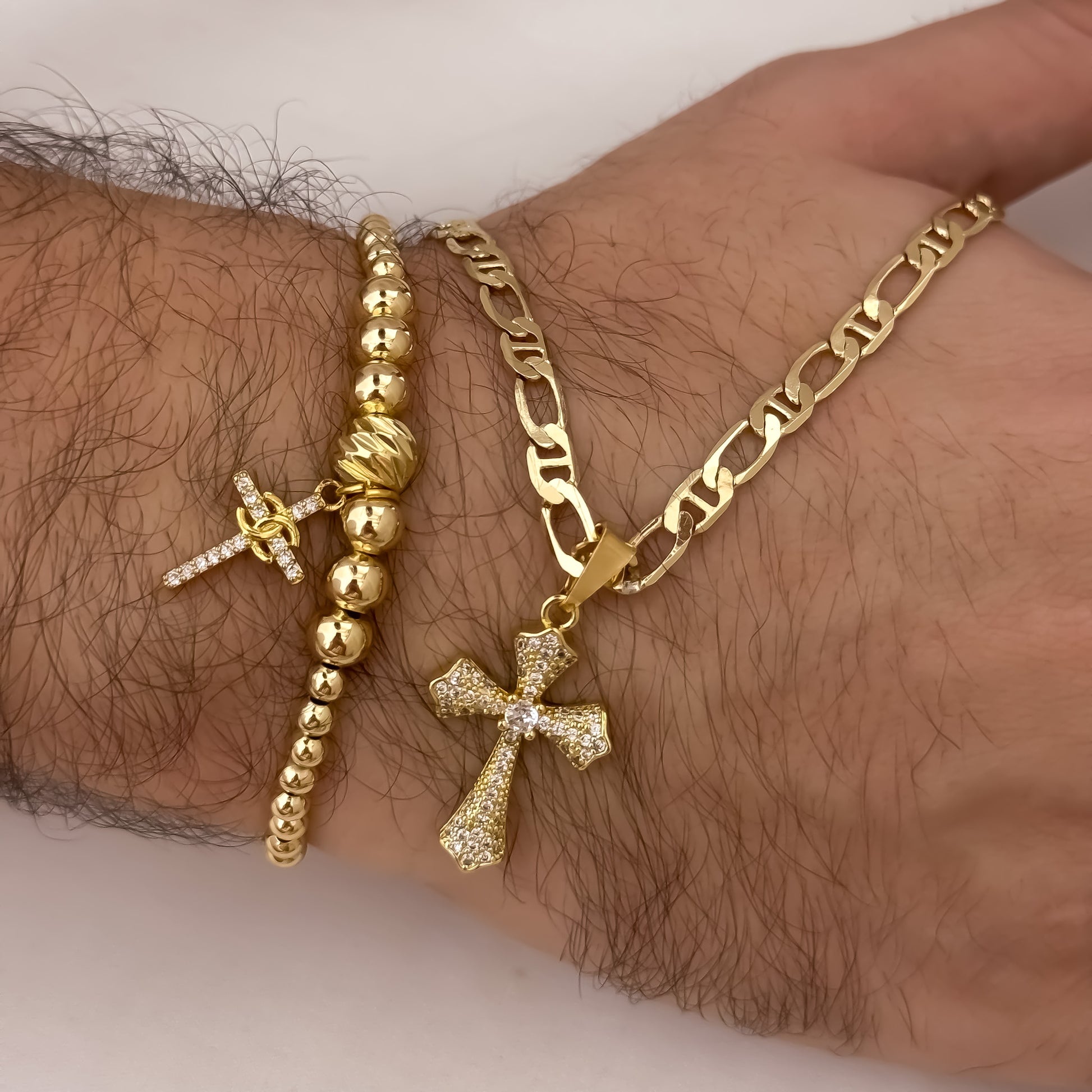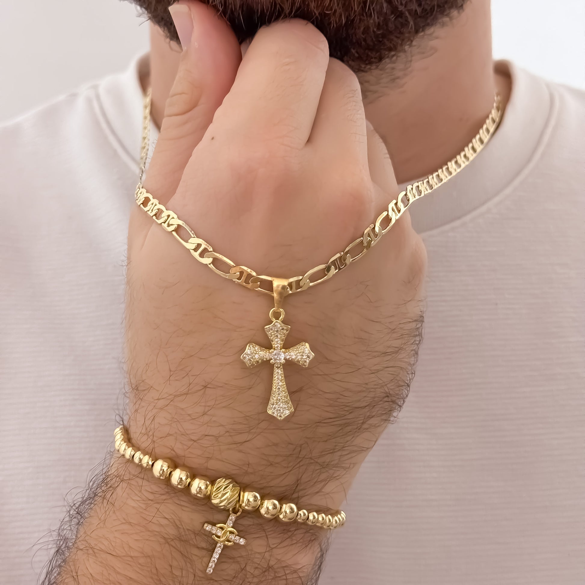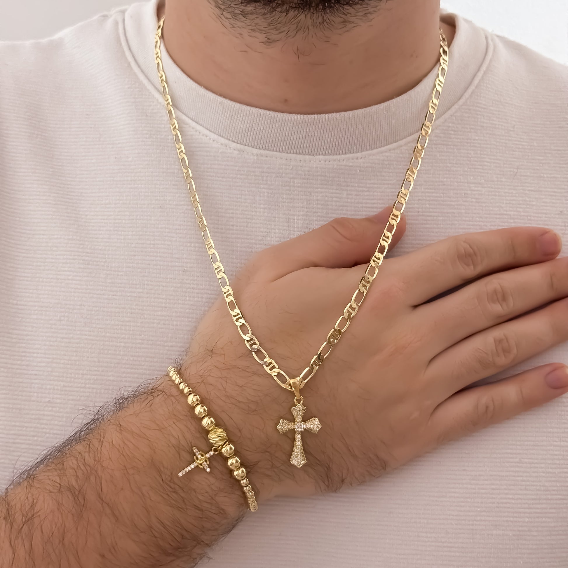 Conjunto Exclusivo para Hombre en Oro Laminado 18K Cadena + Dije de Cruz Trébol + Pulsera Full Balines